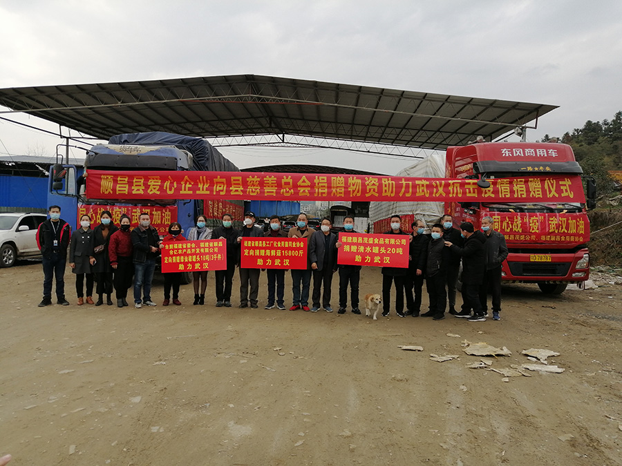 2020年3月6日,福建省順昌縣愛(ài)心企業(yè)向縣慈善總會(huì)定向捐贈(zèng)的第二批物資助力武漢捐贈(zèng)儀式在順昌縣綠通物流舉行。由臺(tái)盟福建省委會(huì)、福建省順昌合億農(nóng)產(chǎn)品開發(fā)有限公司捐贈(zèng)的綠仙椒罐頭10噸(3千件)、福建順昌茂盛食品有限公司捐贈(zèng)的清水罐頭20噸、福建省順昌縣工廠化食用菌同業(yè)協(xié)會(huì)捐贈(zèng)的海鮮菇18800斤等物資帶著順昌人民與武漢人民共克時(shí)艱、共抗疫情的深情厚意無(wú)償馳援武漢。