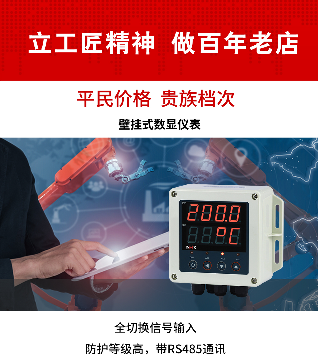 虹潤(rùn)公司是專(zhuān)業(yè)生產(chǎn)數(shù)顯表的國(guó)家專(zhuān)精特新“小巨人”企業(yè),生產(chǎn)的壁掛式數(shù)顯儀表,具有全切換信號(hào)輸入,高抗干擾,IP65防護(hù)等級(jí),全隔離設(shè)計(jì),變送輸出或RS485通訊等特點(diǎn)。產(chǎn)品獲得巡回檢測(cè)顯示方法及裝置、一種儀表電源等2項(xiàng)國(guó)家發(fā)明專(zhuān)利,主持起草工業(yè)過(guò)程控制系統(tǒng)用模擬輸入兩位或多位輸出儀表、物聯(lián)網(wǎng)智能溫度儀表通用技術(shù)條件等2項(xiàng)國(guó)家標(biāo)準(zhǔn),,以及通信系統(tǒng)多通道數(shù)據(jù)采集控制終端規(guī)范軍用標(biāo)準(zhǔn),參與國(guó)際5G標(biāo)準(zhǔn)制定,取得簡(jiǎn)易數(shù)顯儀表等3項(xiàng)相關(guān)軟件著作權(quán)。產(chǎn)品廣泛應(yīng)用于電力、石化、冶金、化工、造紙、食品、輕工、制藥、熱處理、水處理、機(jī)械配套等各種工業(yè)現(xiàn)場(chǎng)。