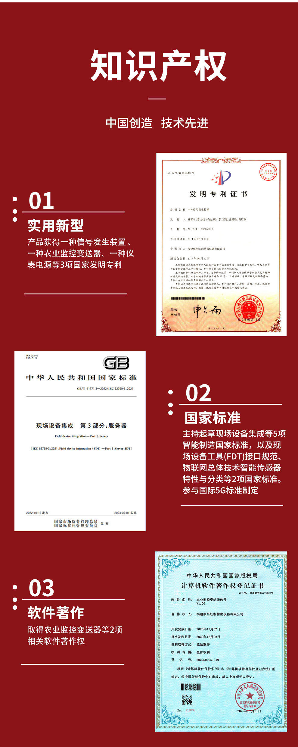 虹潤公司是專業(yè)生產(chǎn)環(huán)境監(jiān)測儀表的國家專精特新“小巨人”企業(yè)。生產(chǎn)的氧氣變送器,具有采用電化學(xué)原理,響應(yīng)靈敏,準(zhǔn)確度高,低功耗,模擬量變送輸出或RS485通訊等特點(diǎn)。產(chǎn)品獲得一種農(nóng)業(yè)監(jiān)控變送器、一種儀表電源等2項(xiàng)實(shí)用新型專利,主持起草現(xiàn)場設(shè)備集成等5項(xiàng)智能制造國家標(biāo)準(zhǔn),以及現(xiàn)場設(shè)備工具(FDT)接口規(guī)范、物聯(lián)網(wǎng)總體技術(shù)智能傳感器特性與分類等2項(xiàng)國家標(biāo)準(zhǔn),參與國際5G標(biāo)準(zhǔn)制定,取得農(nóng)業(yè)監(jiān)控變送器等3項(xiàng)相關(guān)軟件著作權(quán)。產(chǎn)品廣泛應(yīng)用于機(jī)房、配電站、地下車庫、工廠倉庫、食品儲存、養(yǎng)殖場、果蔬林園等環(huán)境場合對氧氣濃度的檢測。