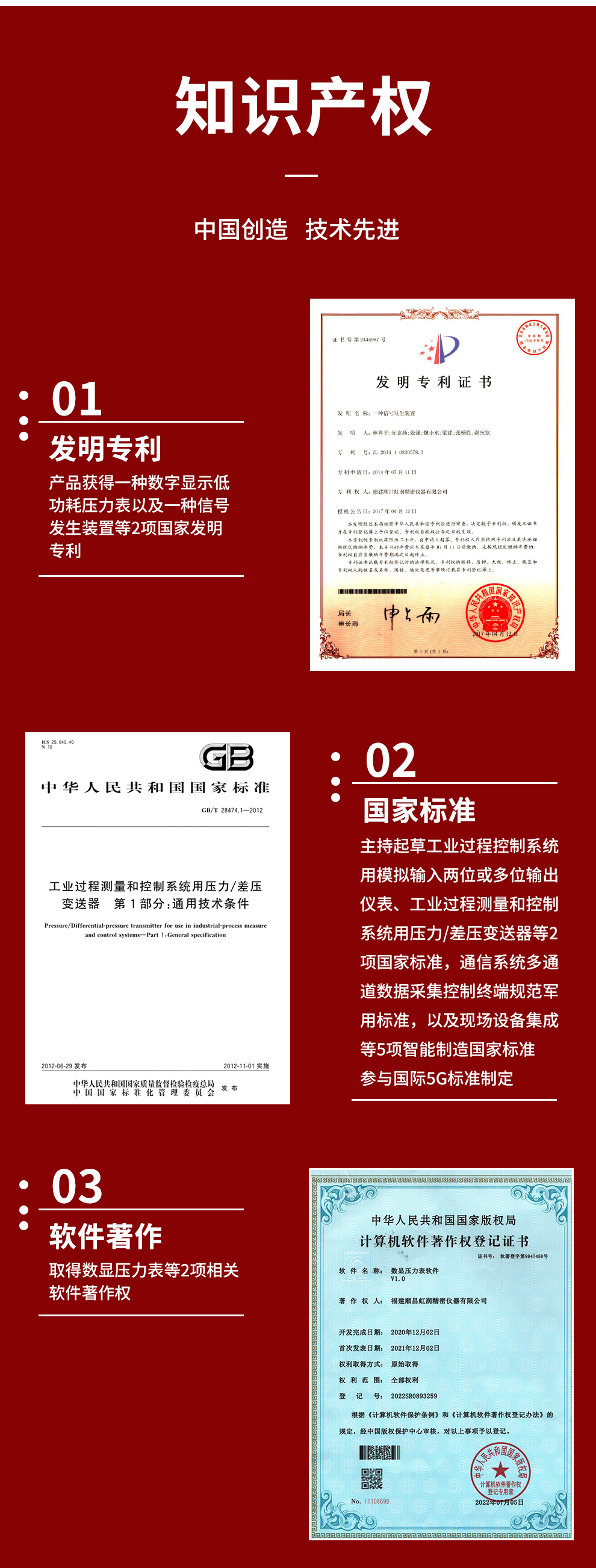 虹潤公司是專業(yè)生產(chǎn)數(shù)顯壓力表的國家專精特新“小巨人”企業(yè)。生產(chǎn)的智能數(shù)字壓力表,具有氣體液體通用,測量精度高,自動溫度補償,響應速度快,電池供電低功耗漂移小等特點。產(chǎn)品獲得一種數(shù)字顯示低功耗壓力表以及一種信號發(fā)生裝置等2項國家發(fā)明專利,主持起草工業(yè)過程控制系統(tǒng)用模擬輸入兩位或多位輸出儀表、工業(yè)過程測量和控制系統(tǒng)用壓力/差壓變送器等2項國家標準,通信系統(tǒng)多通道數(shù)據(jù)采集控制終端規(guī)范軍用標準,以及現(xiàn)場設(shè)備集成等5項智能制造國家標準,參與國際5G標準制定,取得數(shù)顯壓力表等2項相關(guān)軟件著作權(quán)。產(chǎn)品廣泛石化、冶金、電力、制藥、食品、航空航天、工業(yè)循環(huán)水系統(tǒng)等諸多領(lǐng)域。