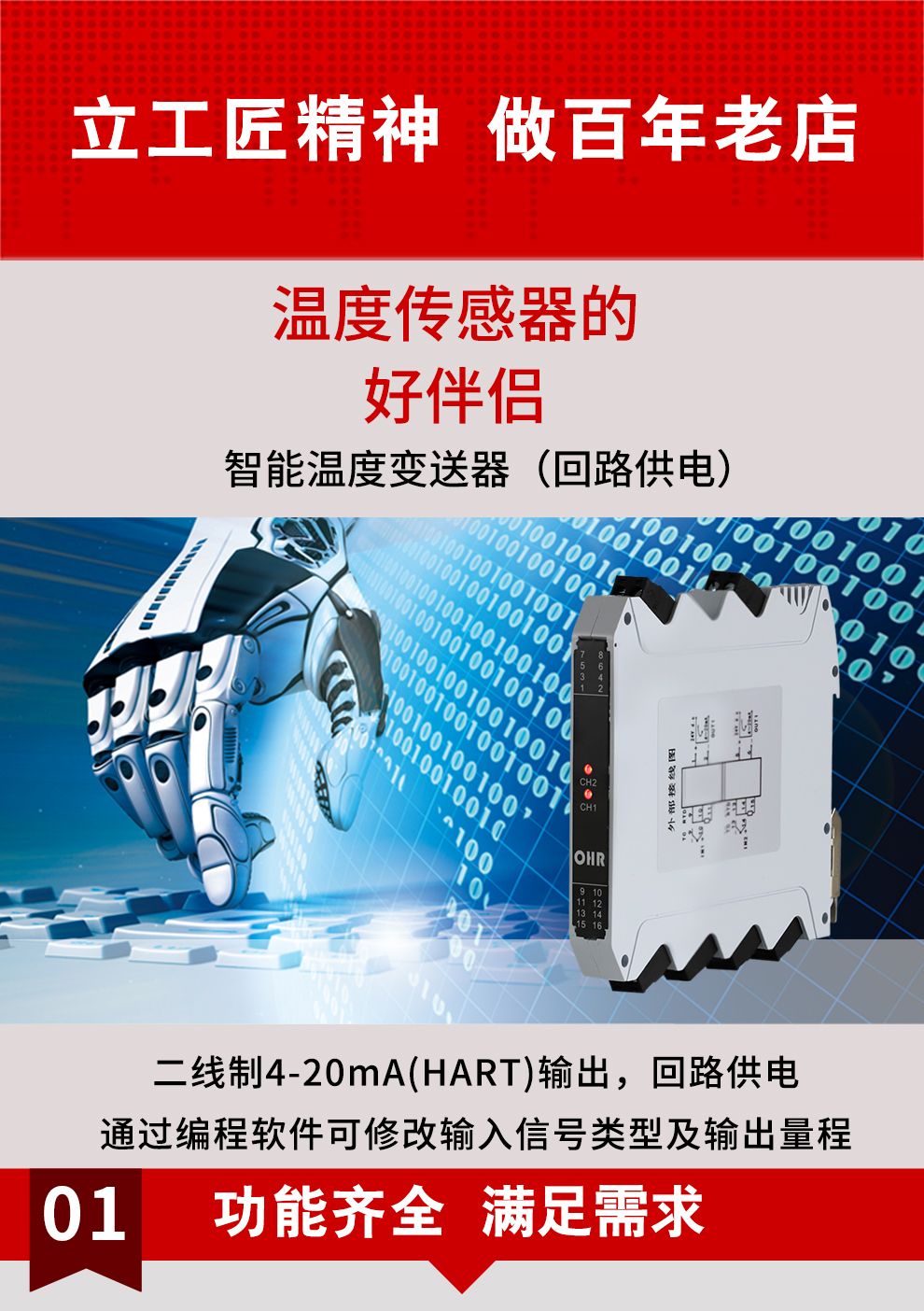 虹潤公司是專業(yè)生產(chǎn)溫度變送器的國家專精特新“小巨人”企業(yè)。生產(chǎn)的HART智能溫度變送器,具有適配各類溫度傳感器,通過編程線修改輸入信號類型及量程,兼容HART的兩線制4-20mA信號,回路供電等特點。該產(chǎn)品不僅通過HART基金會認證、德國萊茵 CE 認證與 SIL 功能安全認證,還獲得具備減震抗干擾能力的溫度變送器、信號隔離器、一種二端子模塊、無源信號隔離器等4項國家發(fā)明專利,主持起草物聯(lián)網(wǎng)智能溫度儀表、現(xiàn)場設(shè)備工具(FDT)接口規(guī)范、工業(yè)過程測量和控制系統(tǒng)用溫度變送器等3項國家標準,以及通信系統(tǒng)多通道數(shù)據(jù)采集控制終端規(guī)范軍用標準,參與國際5G標準制定,取得HART溫度變送器、智能溫度變送器等5項相關(guān)軟件著作權(quán)。產(chǎn)品廣泛應(yīng)用于石油、化工、電力、冶金、制藥、食品、水處理等各種工業(yè)領(lǐng)域。