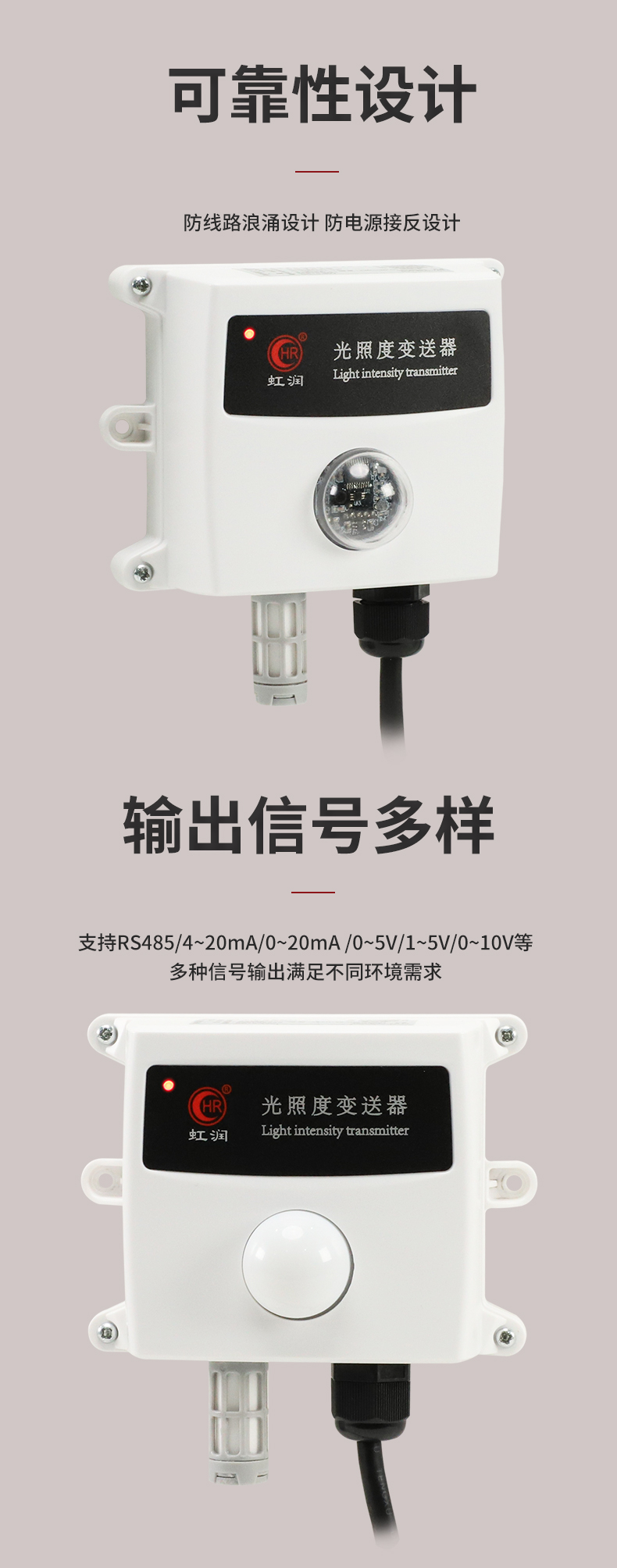 虹潤(rùn)公司是專業(yè)生產(chǎn)環(huán)境監(jiān)測(cè)儀表的國(guó)家專精特新“小巨人”企業(yè)。生產(chǎn)的光照度變送器,具有高精度感光傳感器,響應(yīng)靈敏,準(zhǔn)確度高,低功耗,模擬量變送輸出或RS485通訊等特點(diǎn)。產(chǎn)品獲得一種農(nóng)業(yè)監(jiān)控變送器、一種儀表電源等2項(xiàng)實(shí)用新型專利,主持起草現(xiàn)場(chǎng)設(shè)備集成等5項(xiàng)智能制造國(guó)家標(biāo)準(zhǔn),以及現(xiàn)場(chǎng)設(shè)備工具(FDT)接口規(guī)范、物聯(lián)網(wǎng)總體技術(shù)智能傳感器特性與分類等2項(xiàng)國(guó)家標(biāo)準(zhǔn),參與國(guó)際5G標(biāo)準(zhǔn)制定,取得農(nóng)業(yè)監(jiān)測(cè)變送器等3項(xiàng)相關(guān)軟件著作權(quán)。產(chǎn)品廣泛應(yīng)用于溫室大棚、花卉養(yǎng)殖、科研實(shí)驗(yàn)、智能樓宇、戶外照明等環(huán)境場(chǎng)合對(duì)光照度的檢測(cè)。
