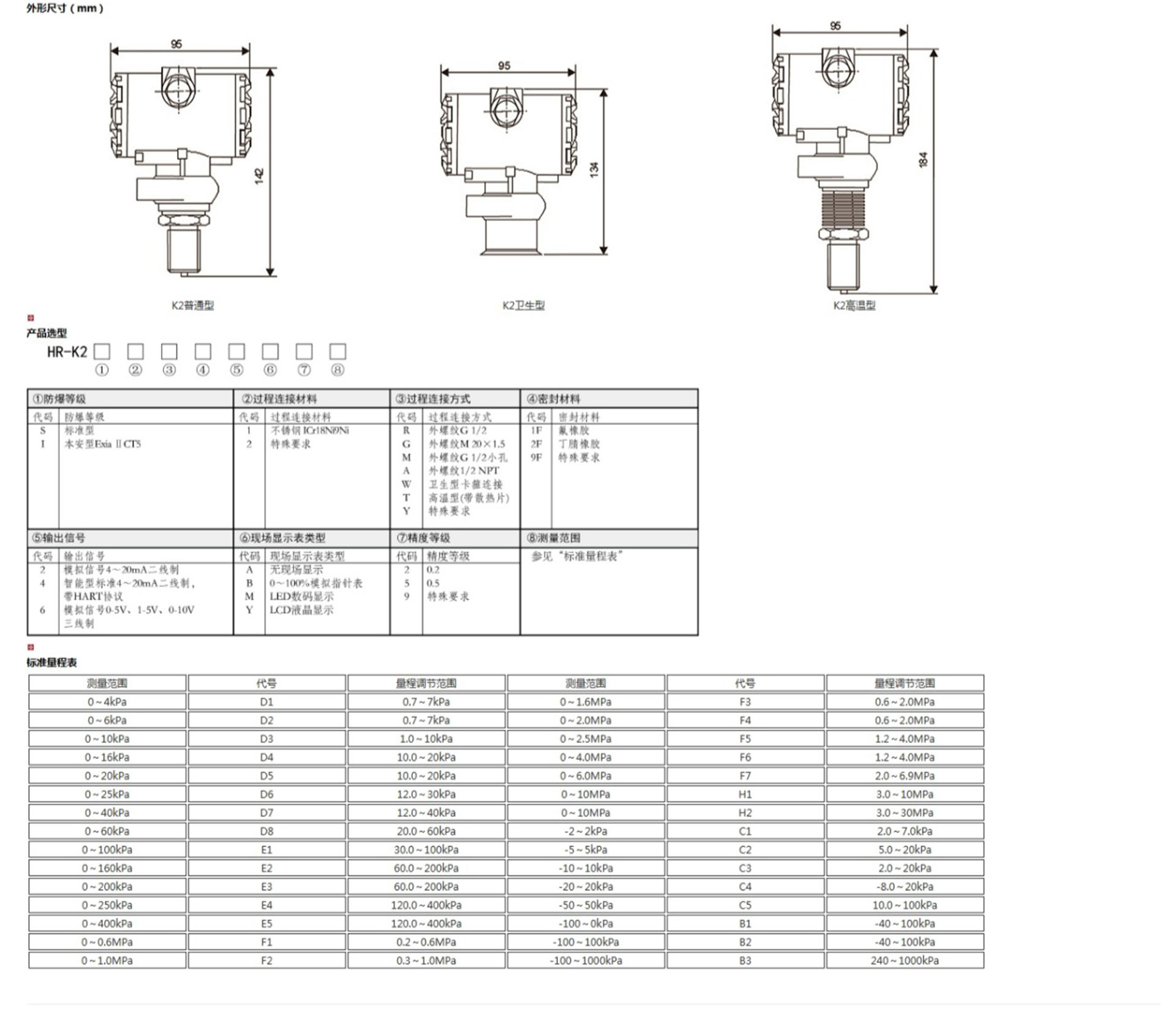 HR-K系列壓力變送器采用具有國(guó)際先進(jìn)水平的擴(kuò)散硅傳感器,配合高精度電子元件,經(jīng)嚴(yán)格的工藝過程裝配而成。充分發(fā)揮了傳感器的技術(shù)優(yōu)勢(shì),使該系列壓力變送器具有優(yōu)異的技術(shù)性能。該變送器抗過載和抗沖擊能力強(qiáng)、溫度漂移小、穩(wěn)定性高,具有很高的測(cè)量精度。